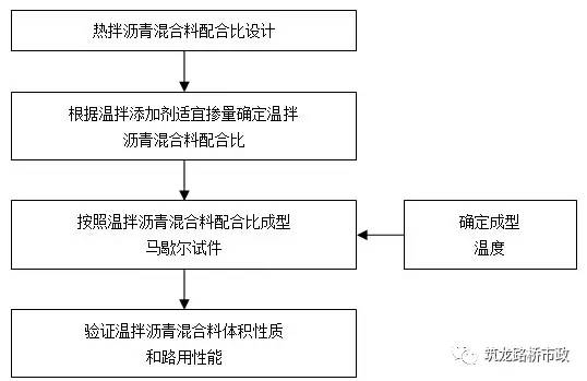 溫拌瀝青混合料的生產配合比設計與熱拌瀝青混合料的設計方法基本一致,只是溫拌瀝青混合料室內成型溫度不同(比熱拌瀝青混合料低20-25℃),溫拌瀝青混合料配合比設計過程見下圖。溫拌添加劑摻量很小,故理論密度計算時可不考慮其影響。